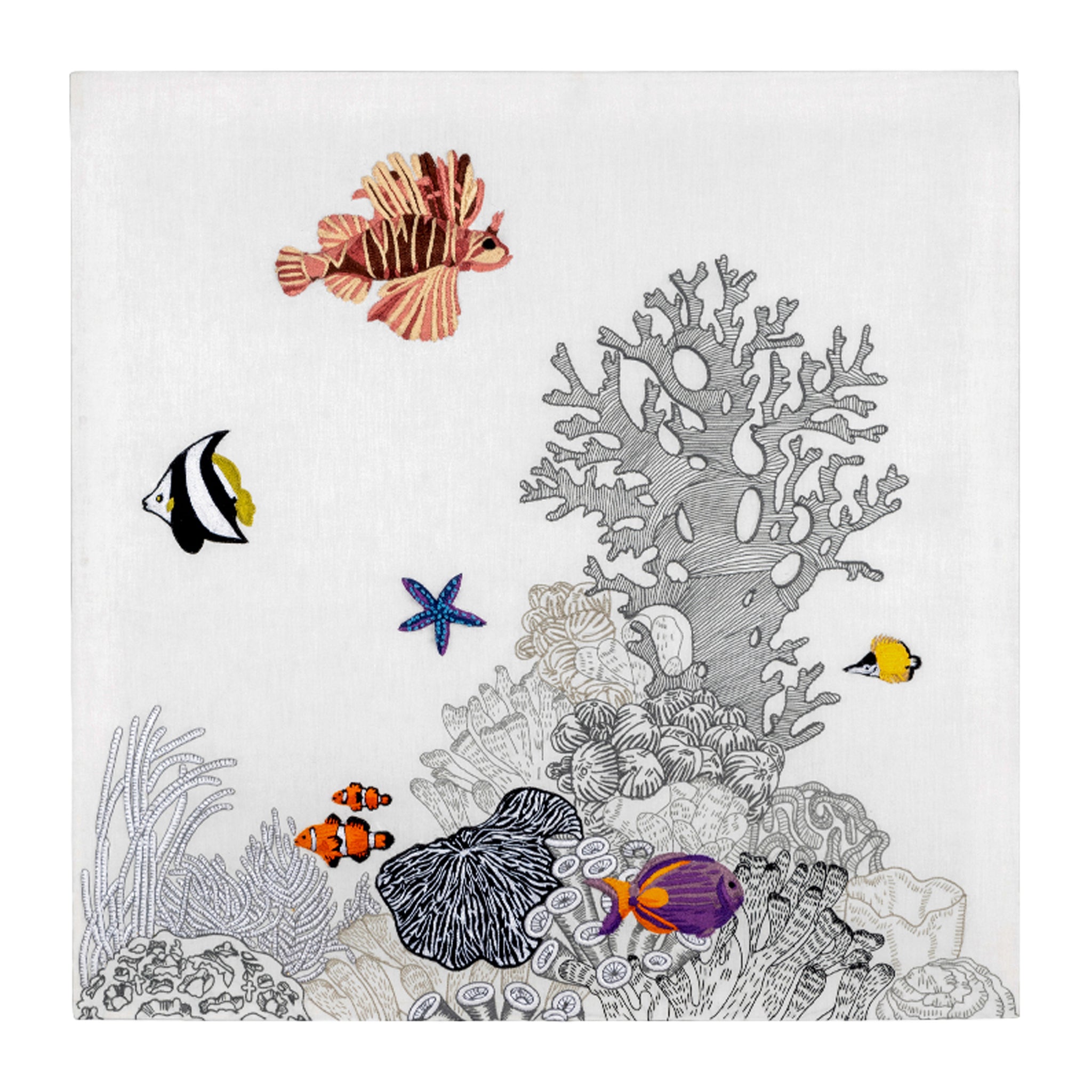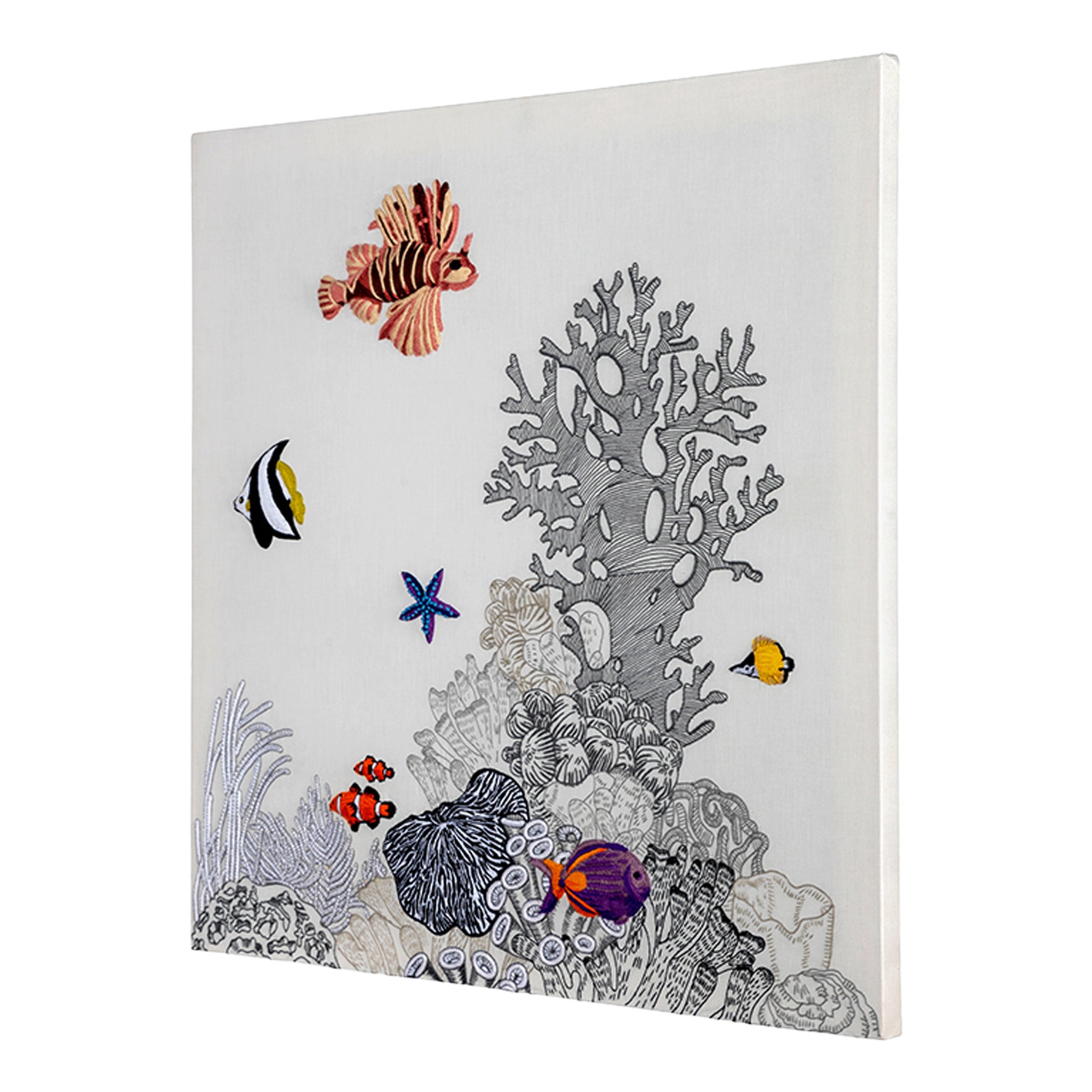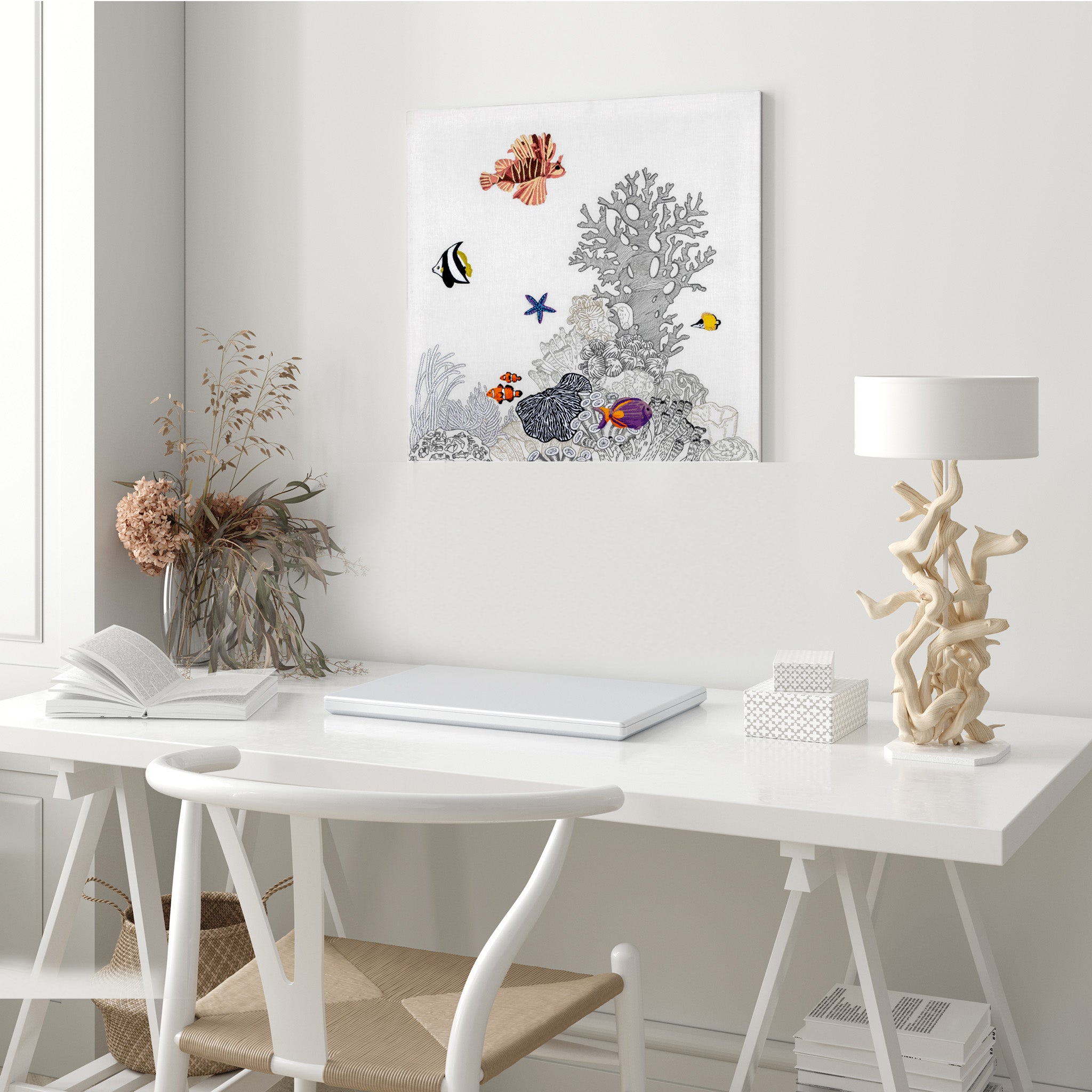 Handcrafted to perfection, the framed textile art piece brings a soothing presence to your hamptsons style decor. Embroidered with great attention to detail by expert artisans, the cotton handloom background showcases a picturesque ocean view on top, complete with coral reefs and colorful fishes - all hand-embroidered to add textural intrigue to your space.