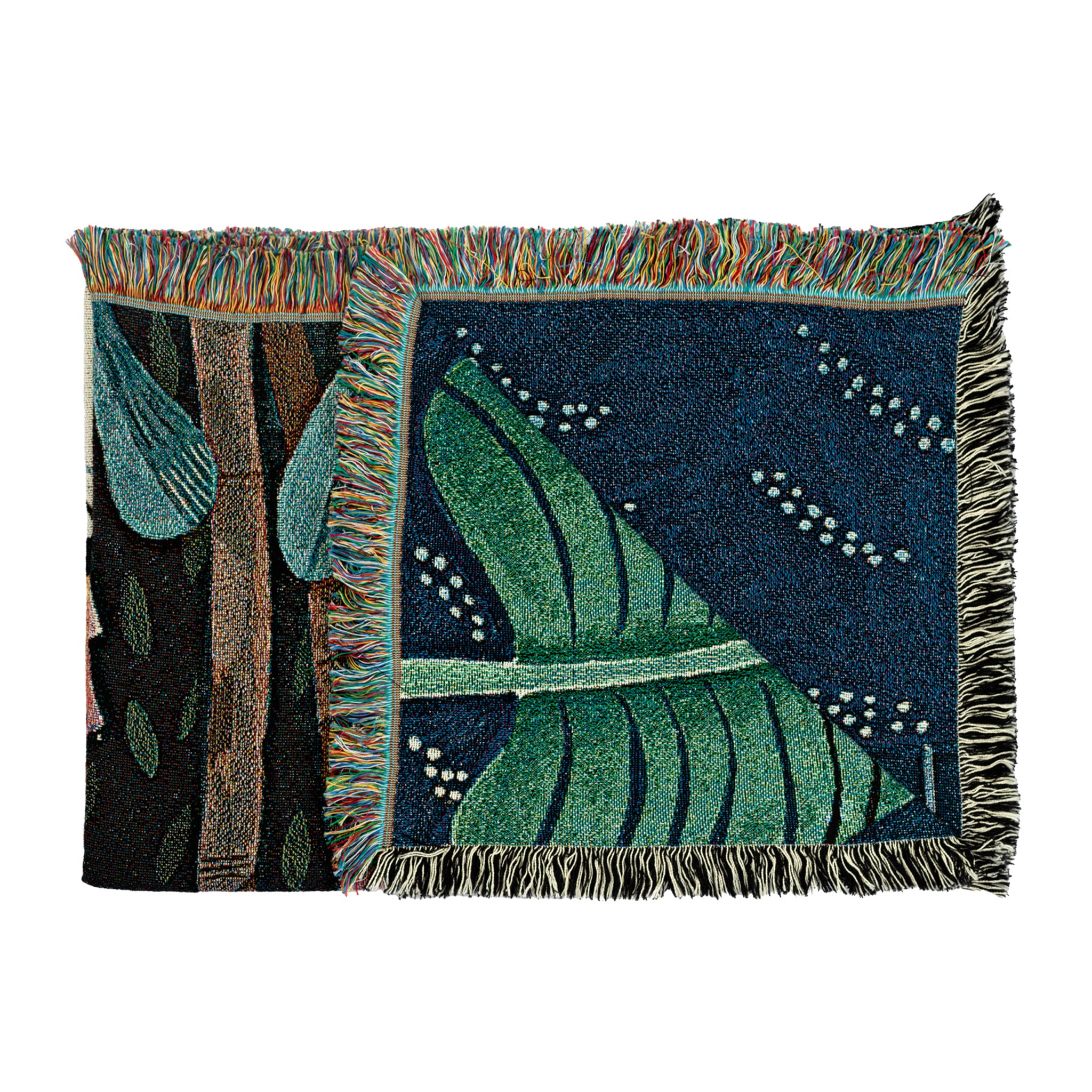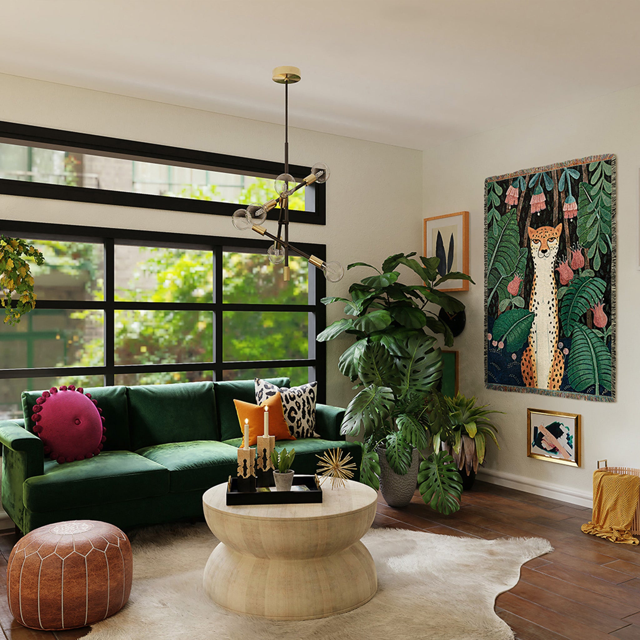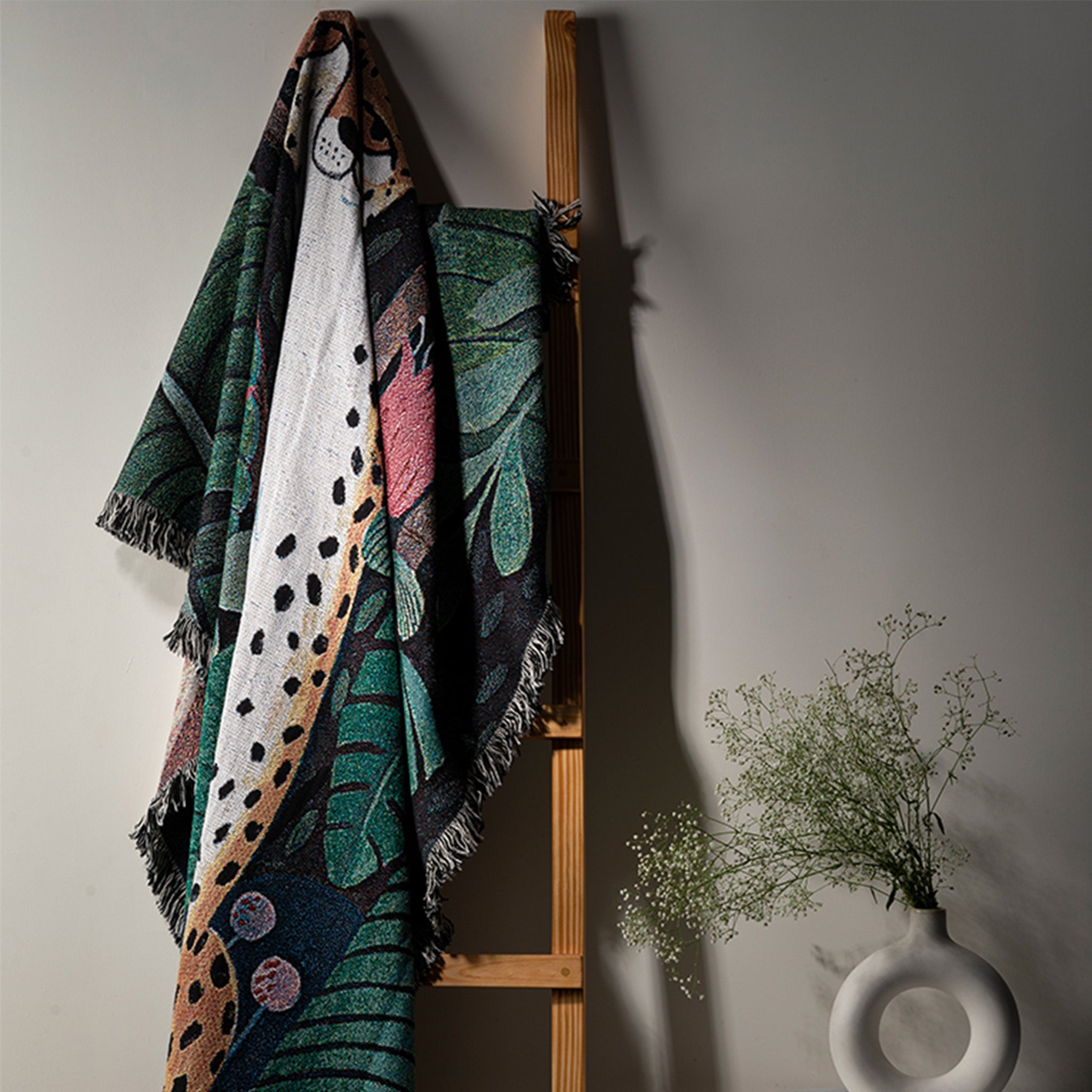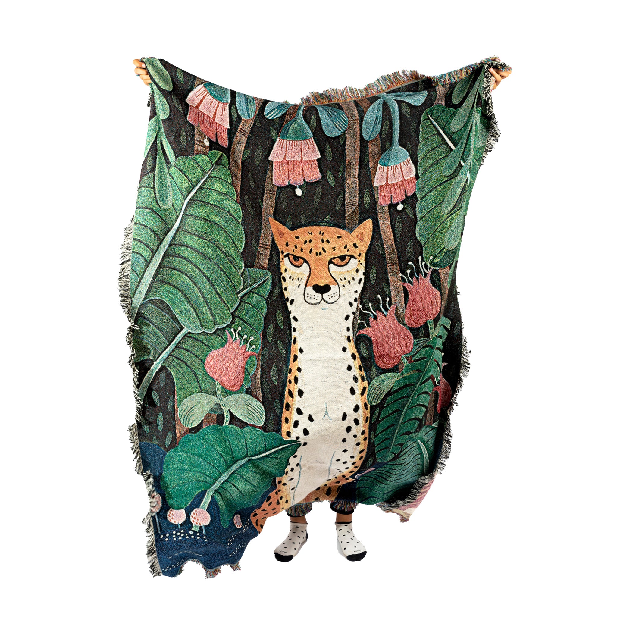 This jungle-themed cotton throw is full of rich hues, transporting you to the lush tropics. Featuring a cheetah sitting amongst jungle foliage, this jacquard-woven this stunning throw will be a great addition, whether on your couch, bed or even on your empty wall.